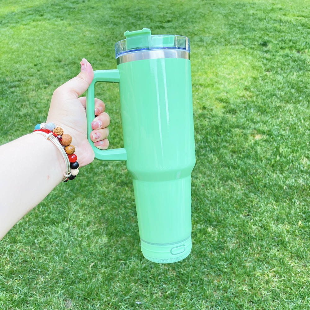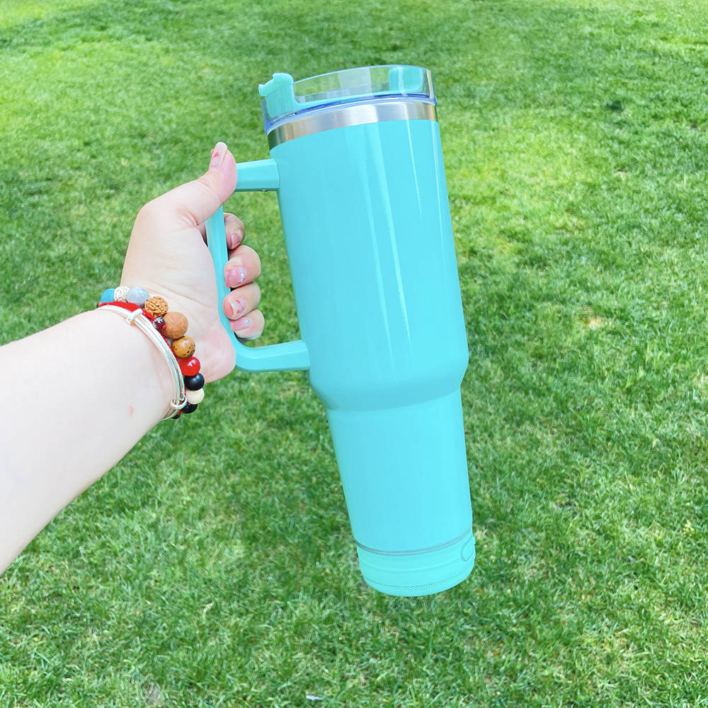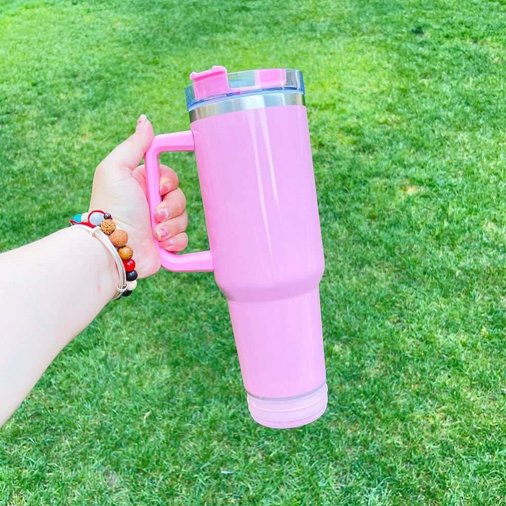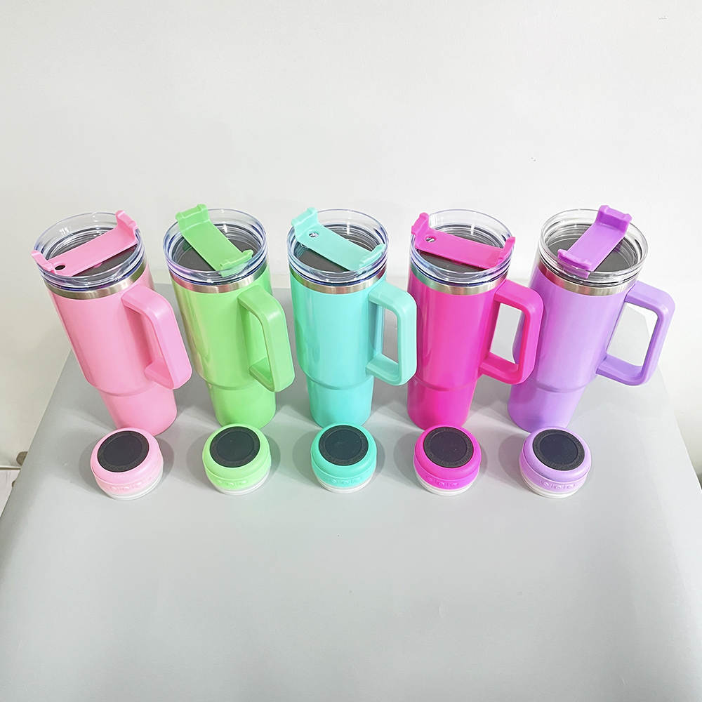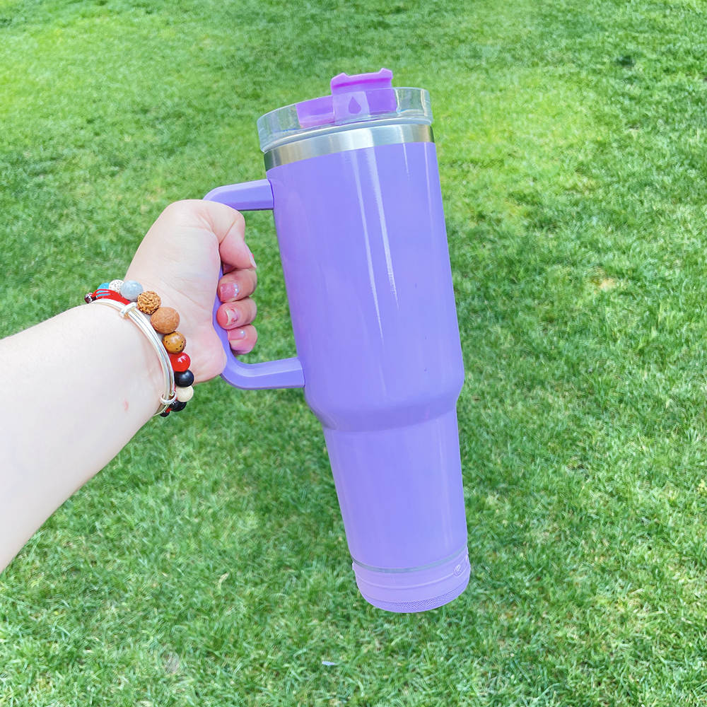 40 oz stanley-style sublimation speaker tumblers.  Come boxed with plastic straws.