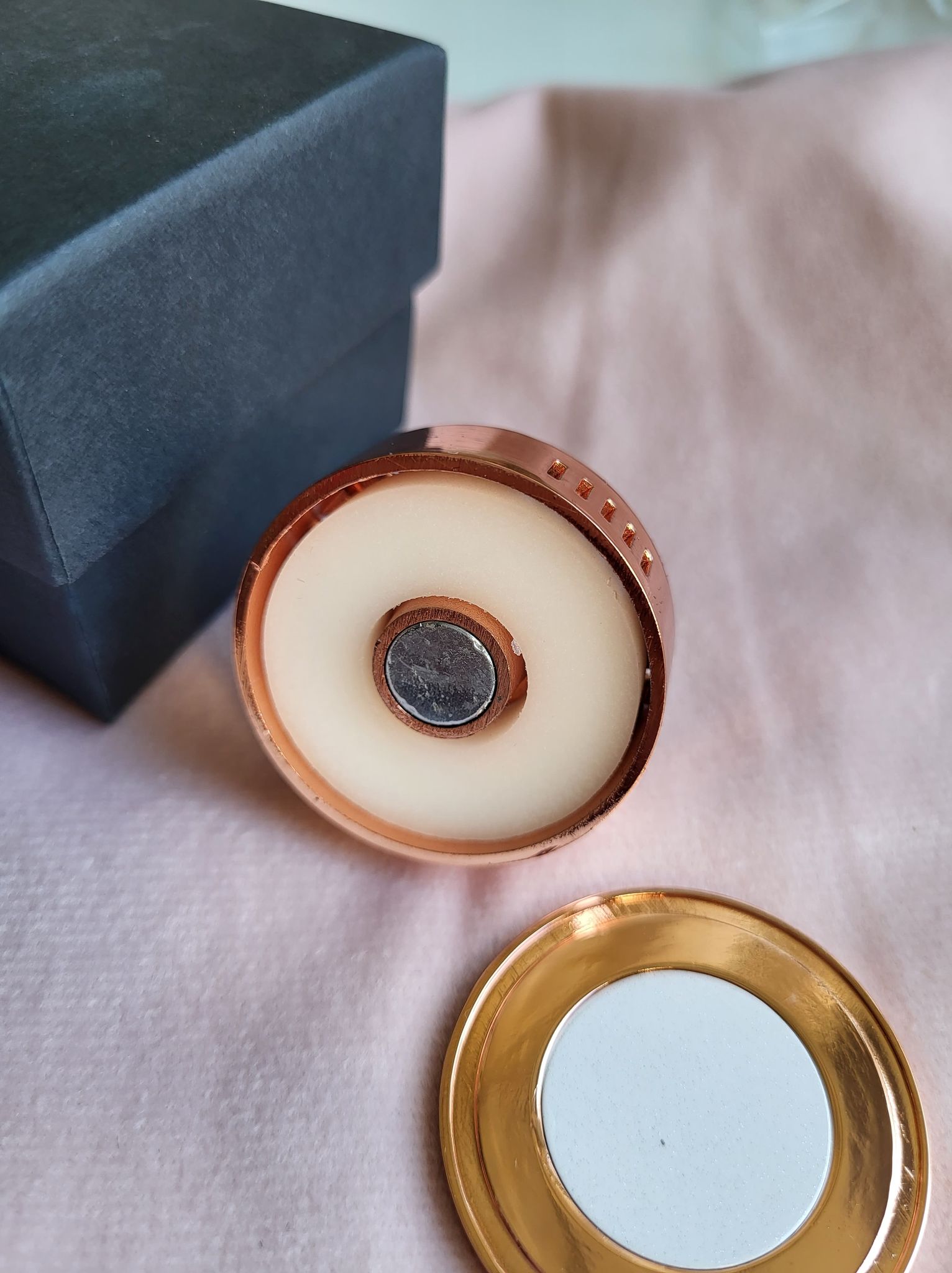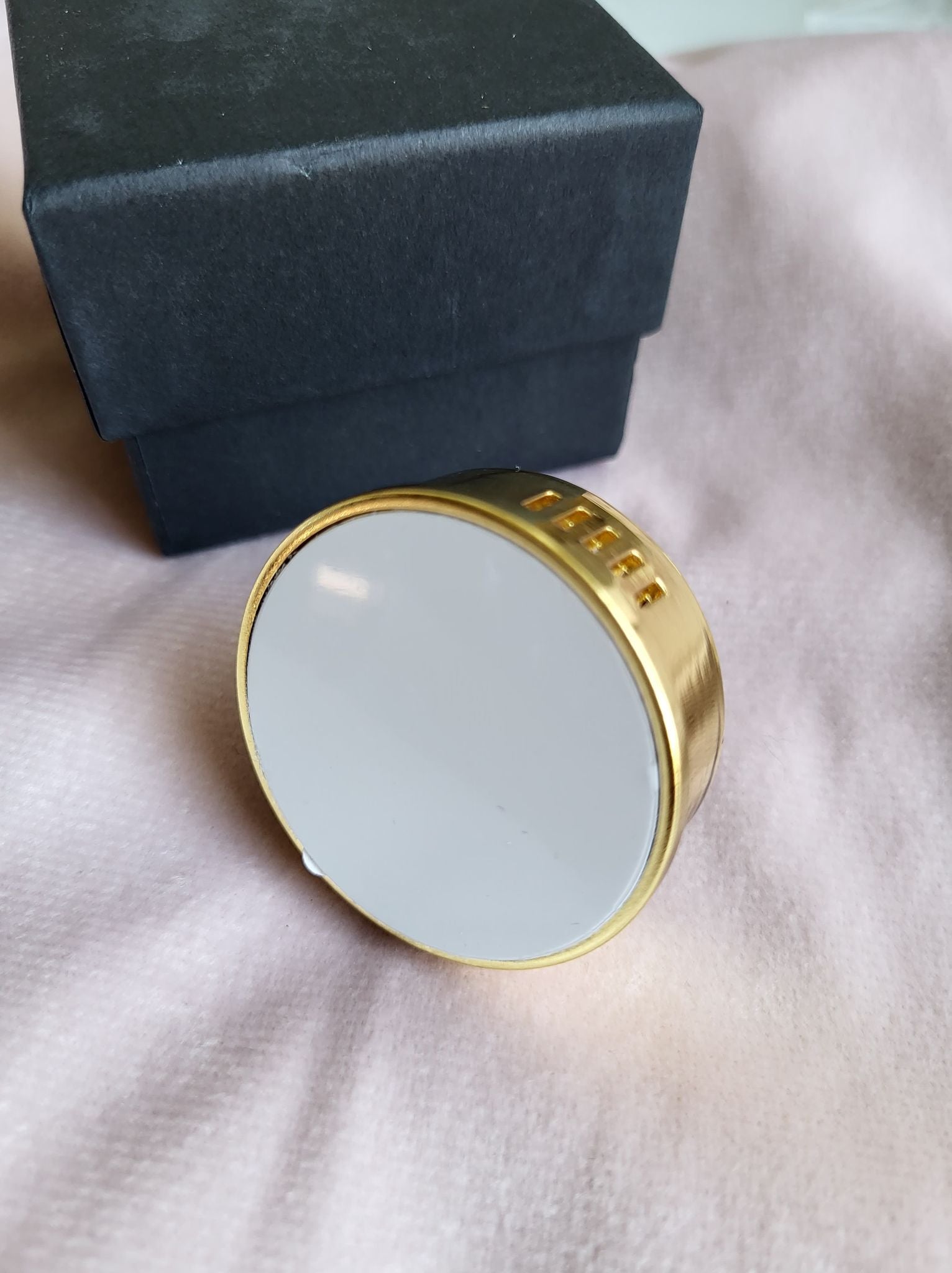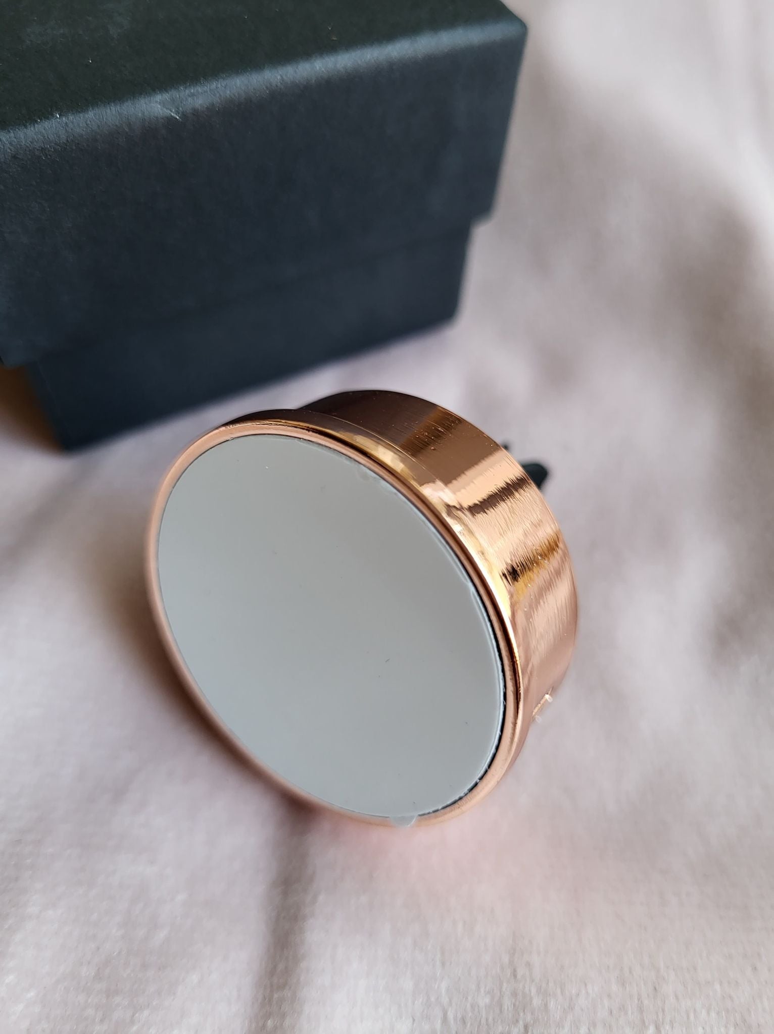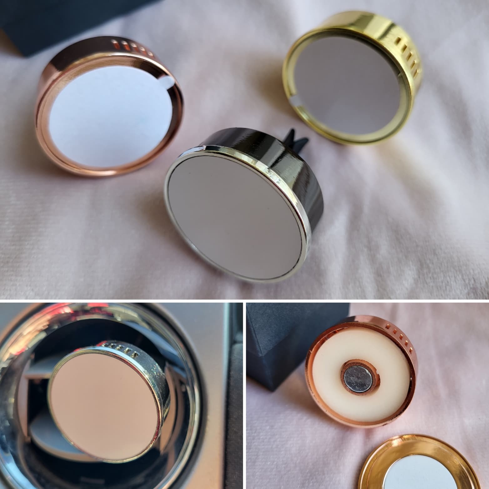 Clip-on auto air fresheners, available in rose gold, gold & silver. They have 1.5" sublimation aluminum disks, and magnetic front panels that remove to insert your fragrance disk. Included in the price will be two tropical orange fragrance disks, ANDY they come individually boxed in beautiful little black boxes!