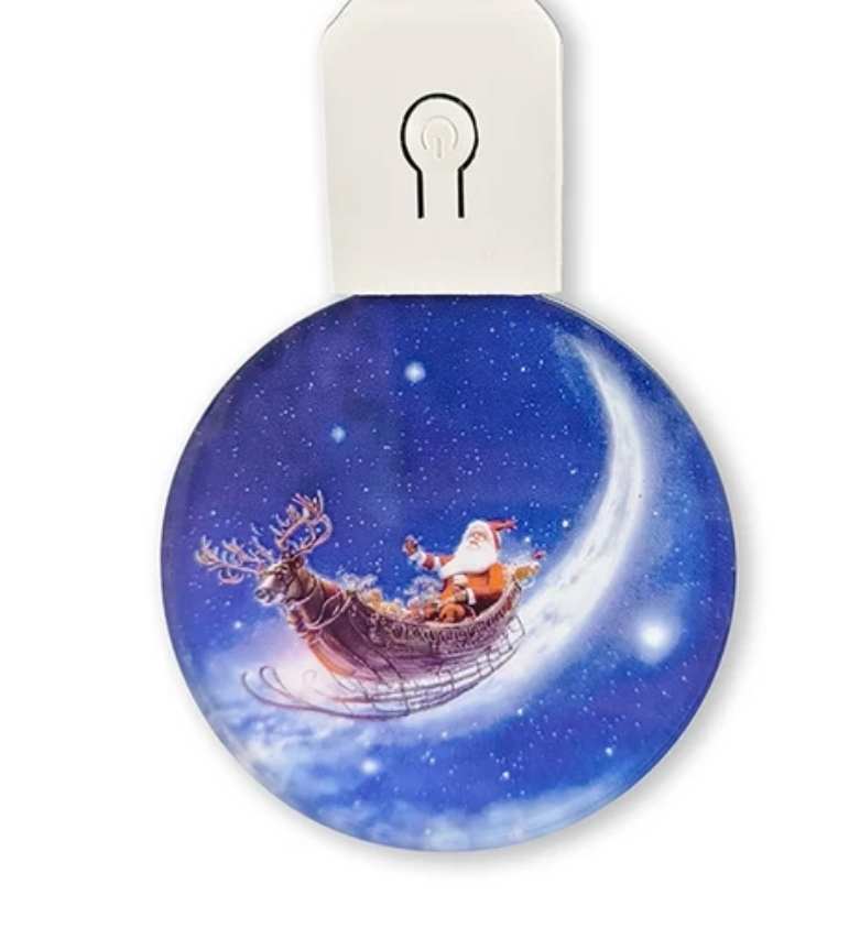 LED Christmas Sublimation Ball Ornament, lighted with a push of a button, choosing between multiple light colours in various modes (steady, flashing, fade). BATTERIES NOW INCLUDED!