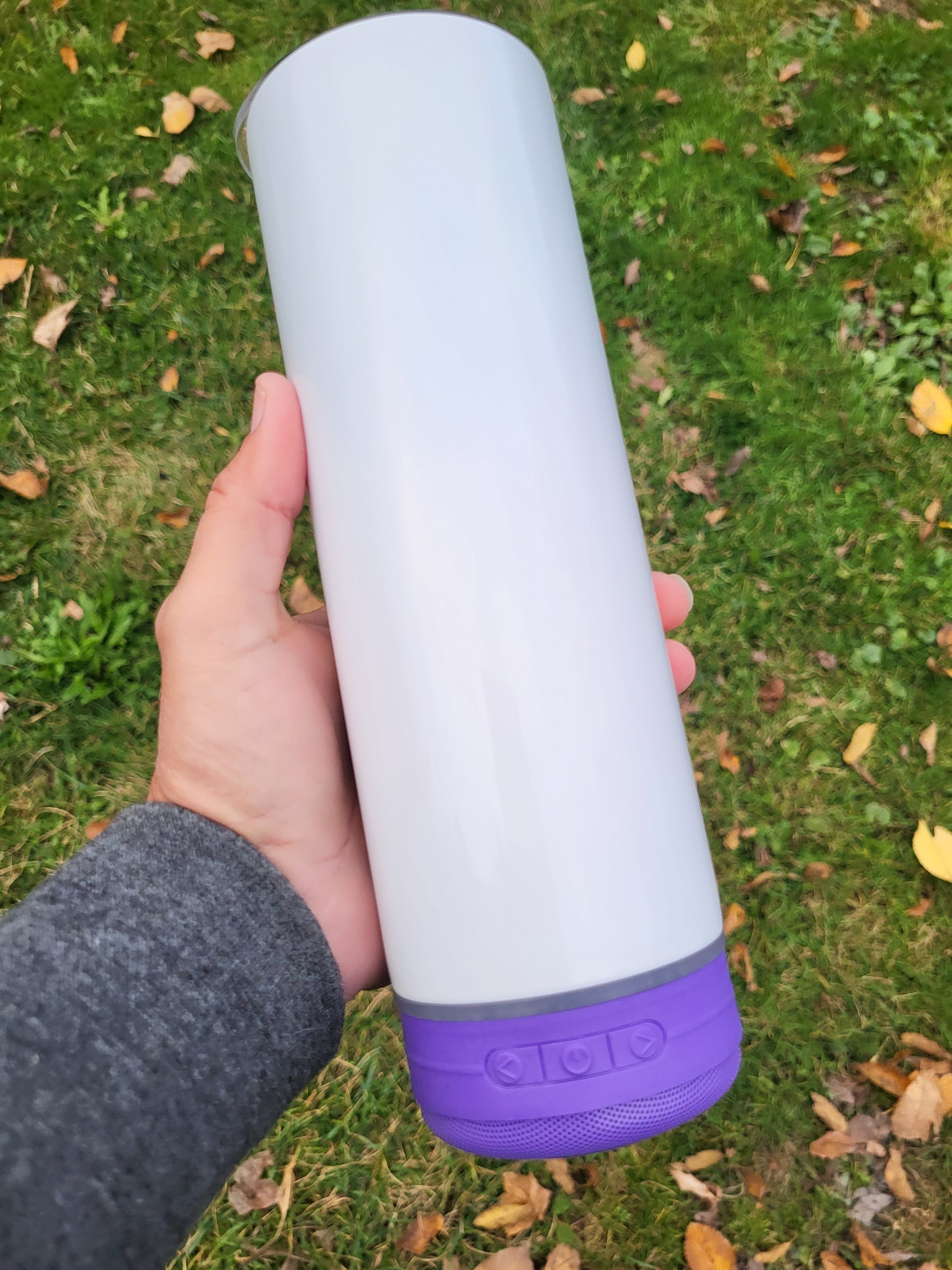 20 oz straight white sublimation speaker tumblers.  Come boxed with plastic straws.