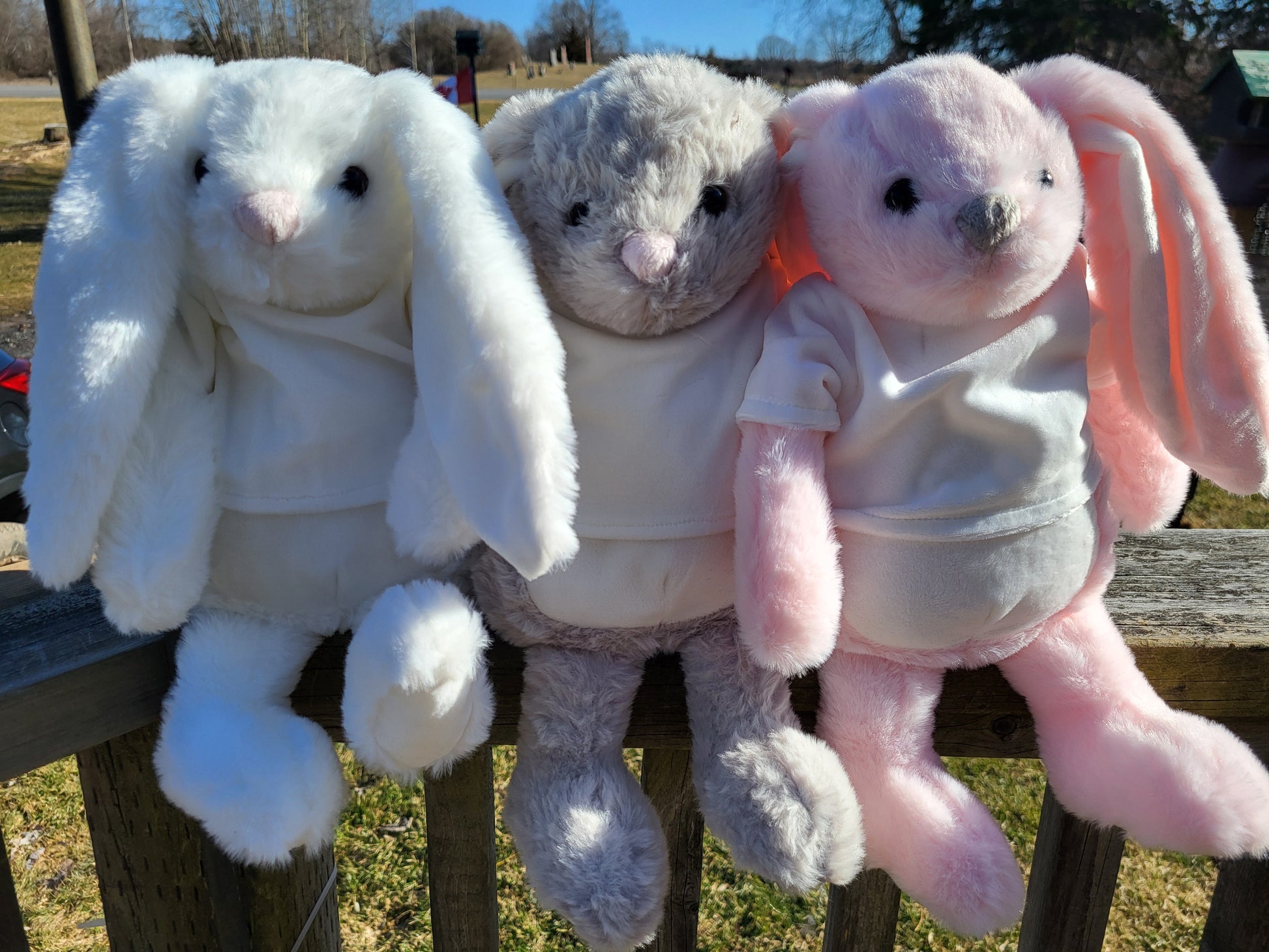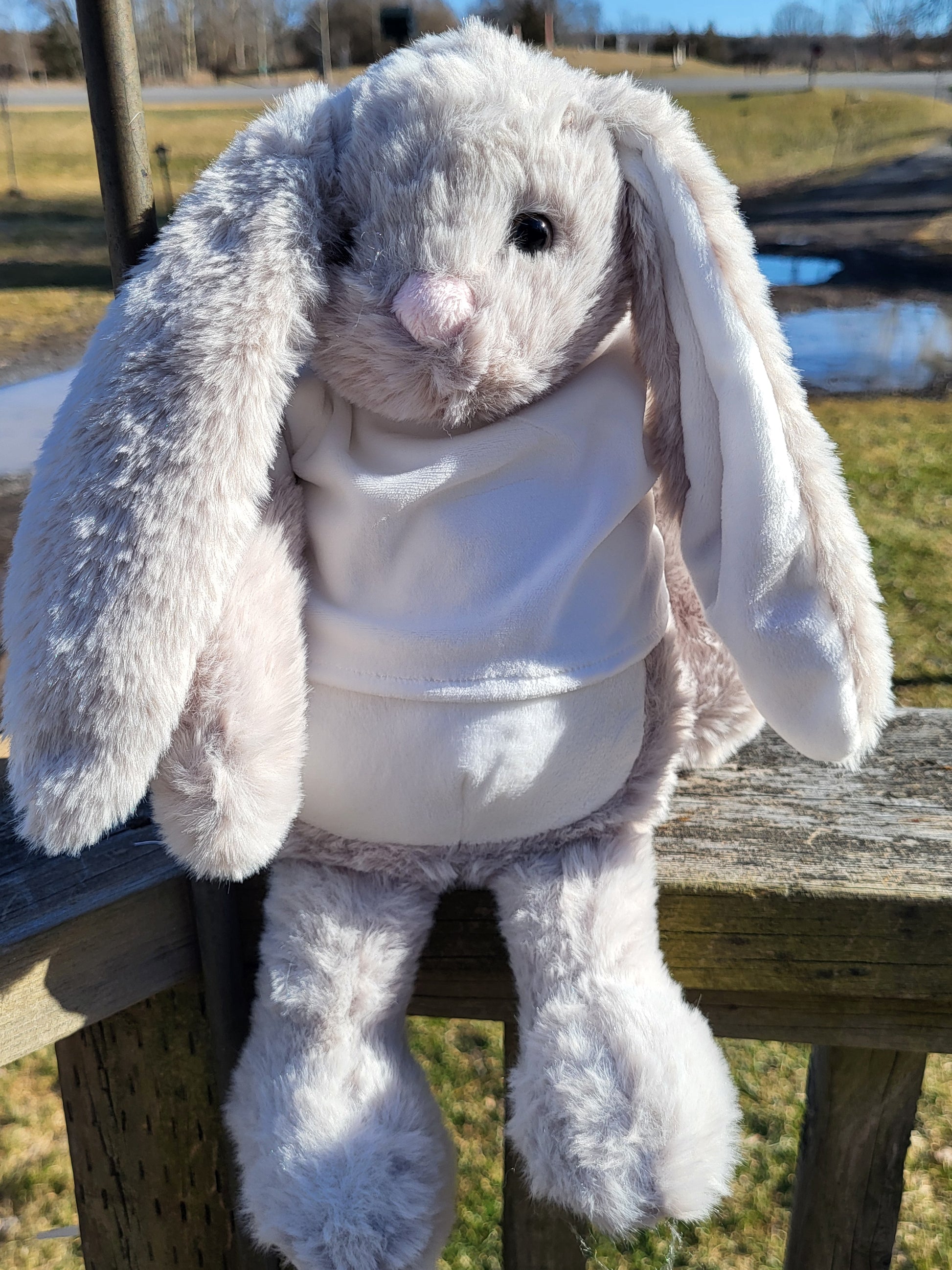 Easter bunnies with sublimation t-shirts. These have nice long ears, also perfect for personalizing with HTV. Available in limited quantities of gray, white, or pink.. Approx 14-15 inches from head toe.