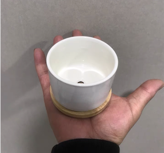 Ceramic flower pots, with drainage holes and bamboo bottom trays. Available in two sizes - 8cm x 5.5cm and 9cm x 6.5cm.  The small ones make the perfect succulent planter.