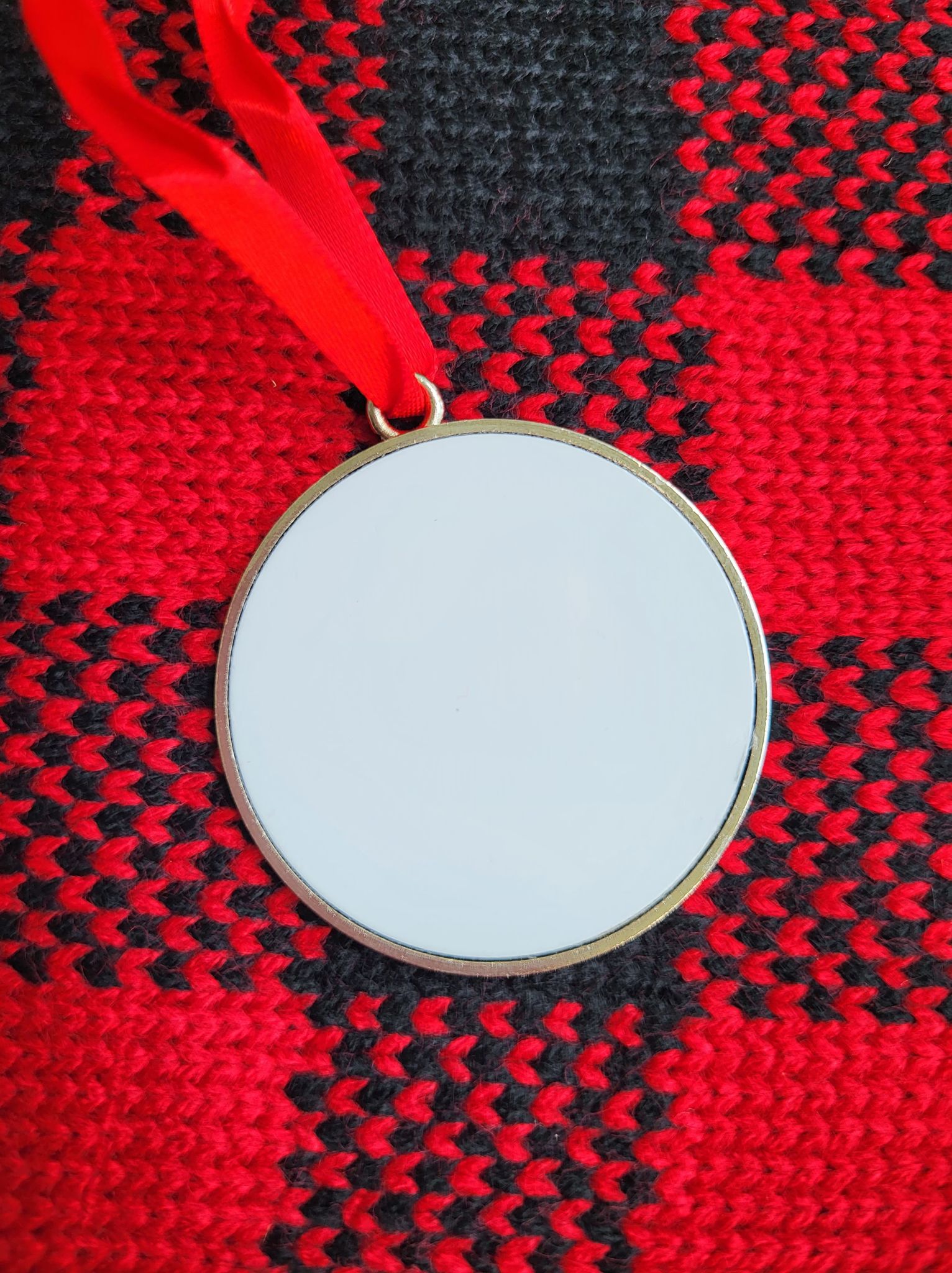 Round Christmas Ornaments - Zinc Alloy Frame with 1.75" aluminum sublimation disk and red ribbon for hanging.