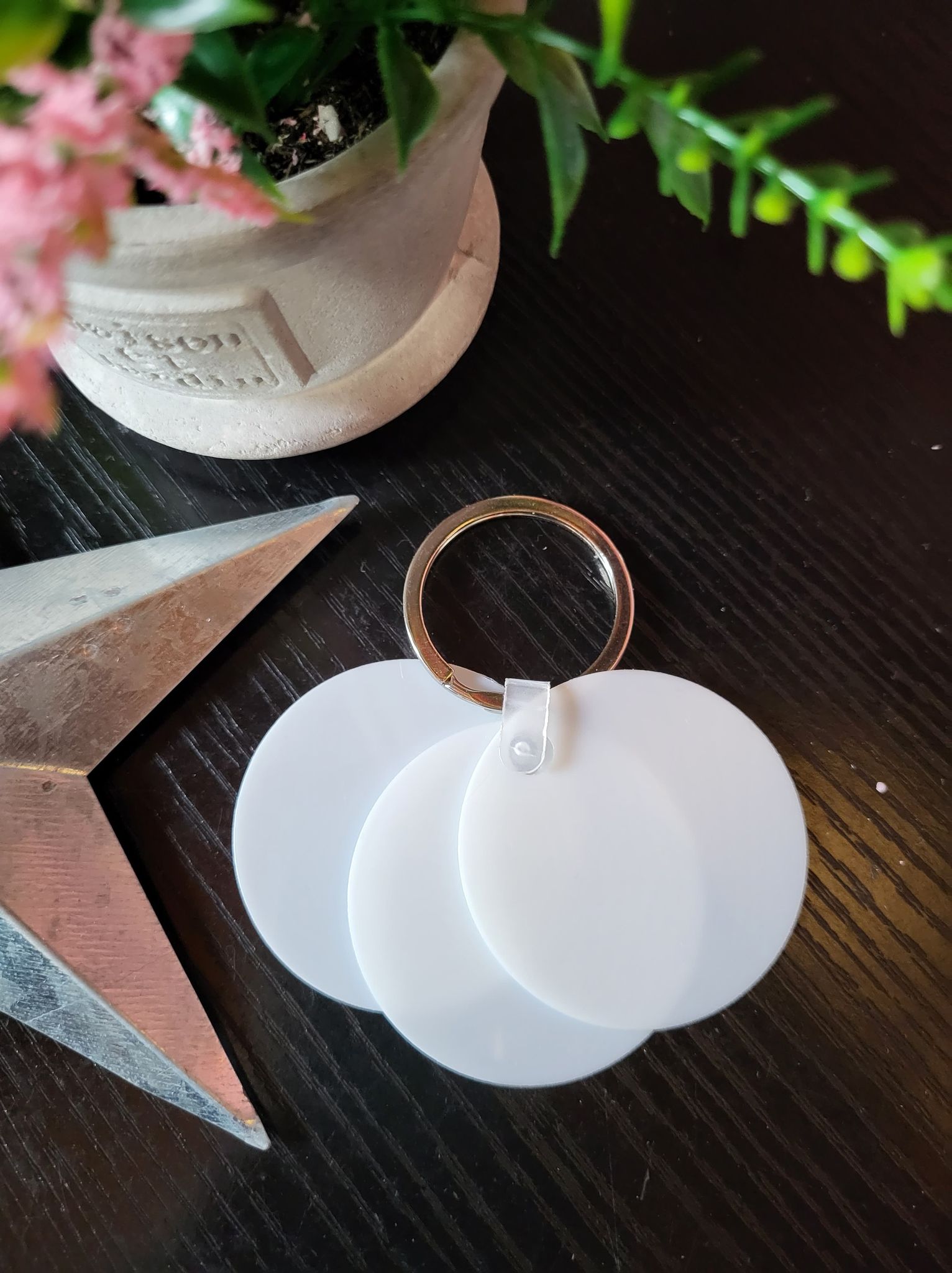 2" sublimation round acrylic keychains.  Three rounds - each disk is double sided.