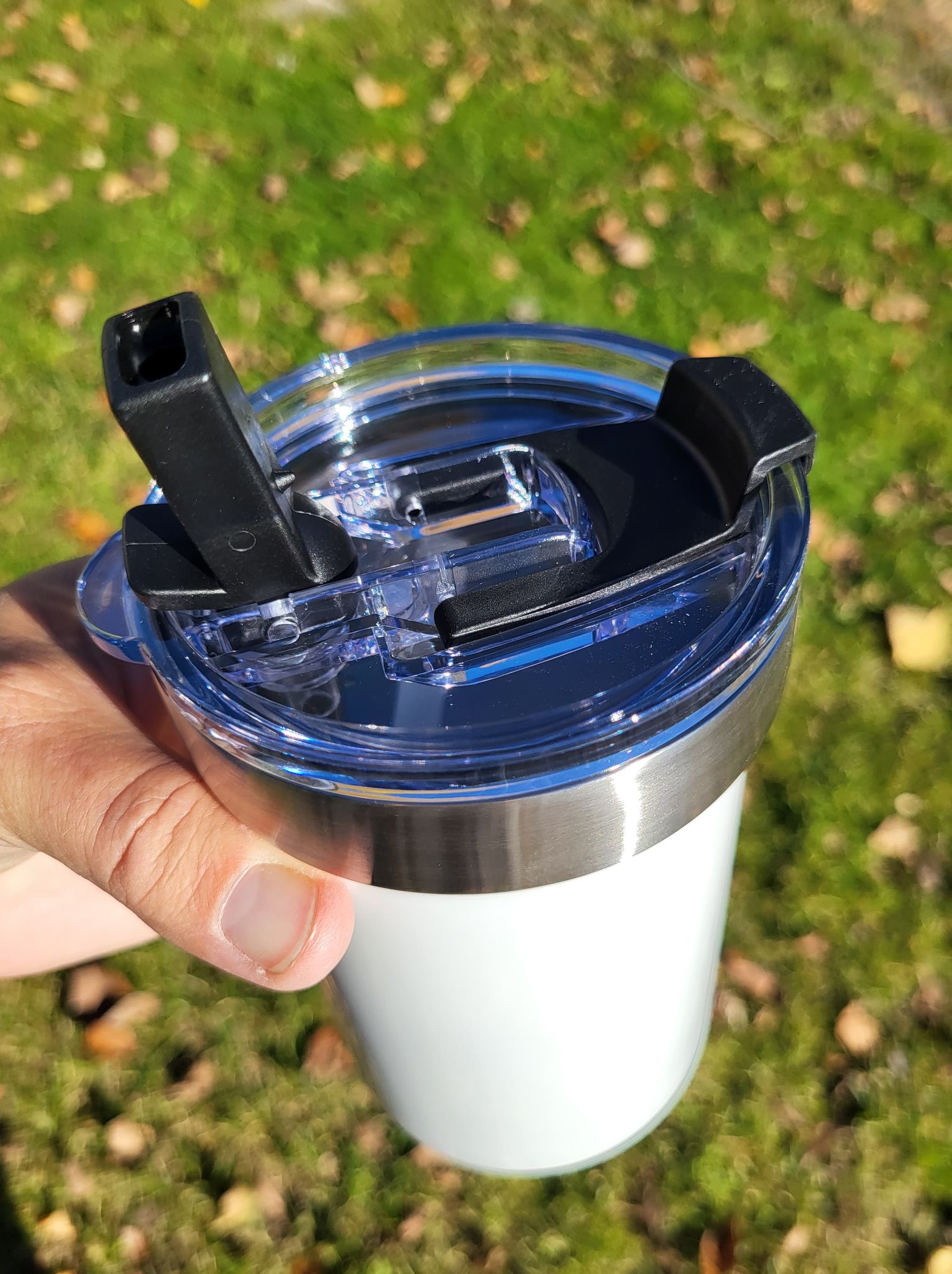 Stainless white sublimation travel tumblers with dual lids; use either the flip top straw or hole. These are made to fit your auto cupholders and come in 18 or 22 oz.  Sublimate beautifully in an oven or press. Individually boxed with straws and rubber bottoms.