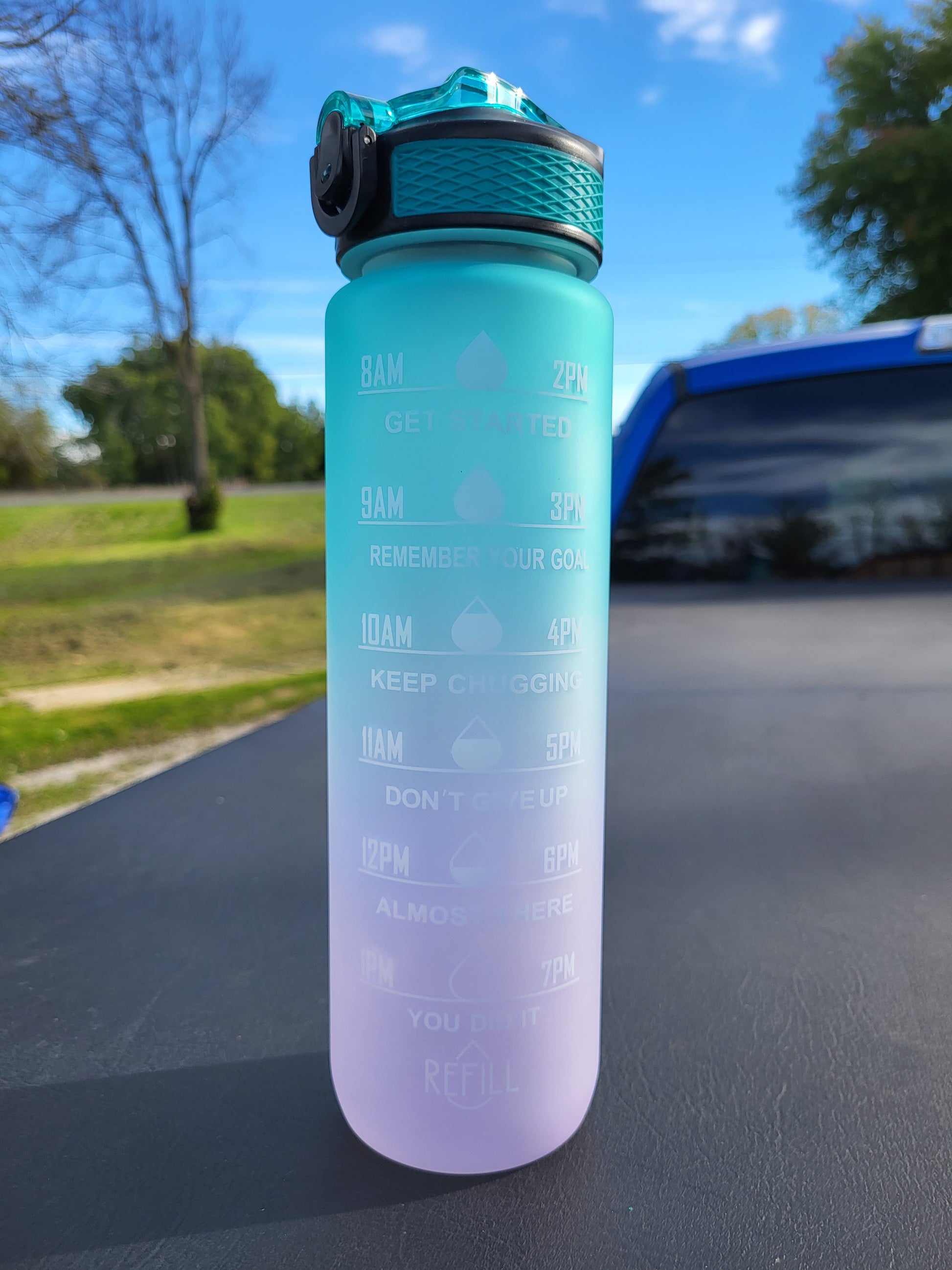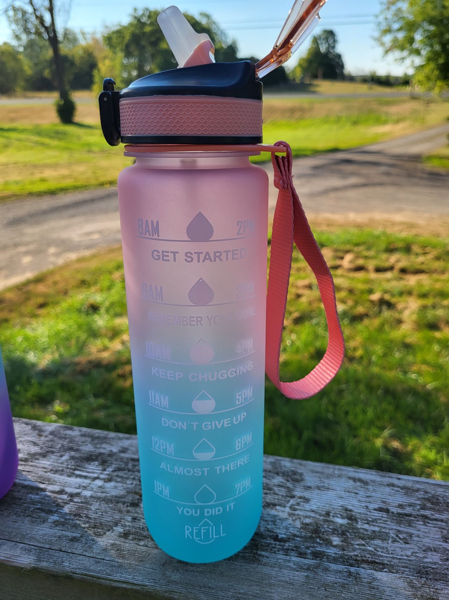 1L motivational plastic water bottles, preprinted with sayings and measurements, with wrist strap and flip top. Available in 4 variations of gradient colours. Easy to personalize with permanent vinyl.