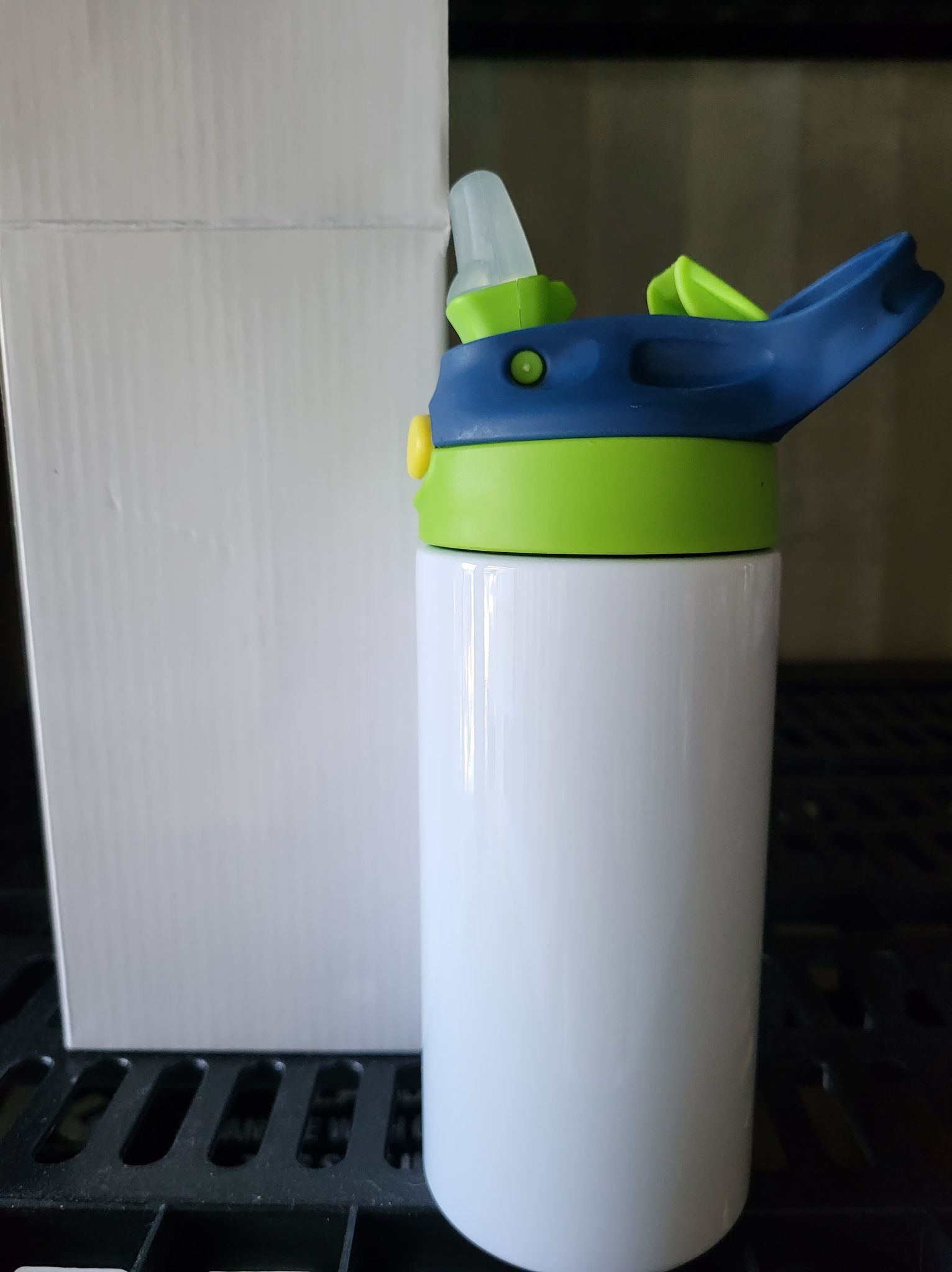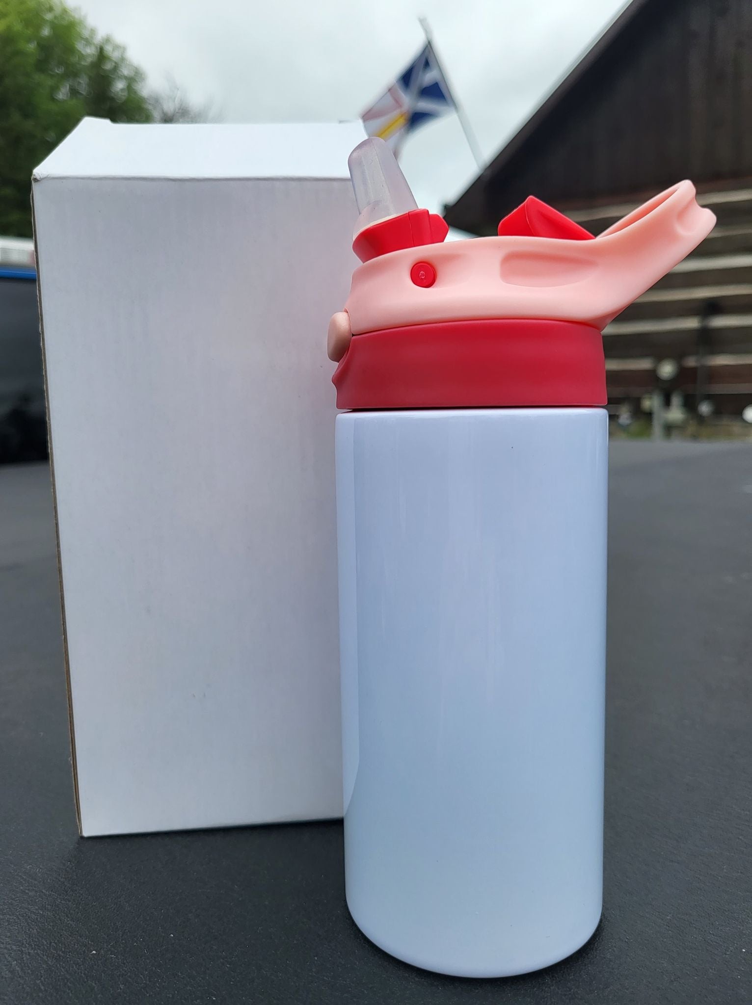 Kid's straight stainless sublimation water bottles. Built in straws, available in various colours.